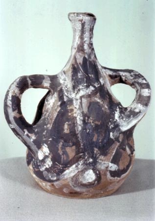 I called this pot a Woman vase. It was made in 1962. 30 cms h. It was fired to earthernware temperature, unglazed, and the decoration owes something to Aboriginal rock art paintings, and also 'body' decoration. At the time I made it I thought is was of 'breakthrough' significance, if only to me. It was exhibited at my first major exhibition in Sydney all those years ago, at the Rudy Komon Gallery. In one sense I am sorry it is not still in my possession. |