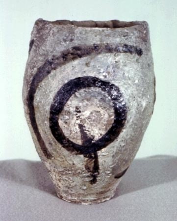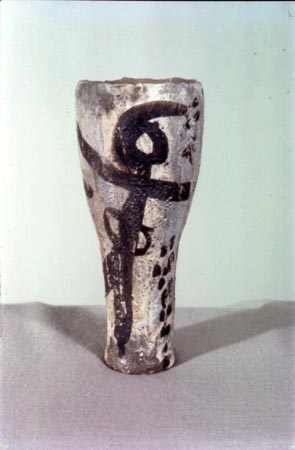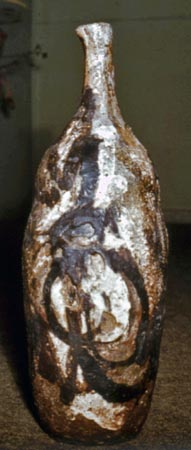 This vase was made in 1963 at Tarragindi. h.40 cms. It was one of my first stoneware pots and was chosen to represent Australia in an International Exhibition of Contemporary Craft that toured parts of Japan in 1964-65. On its return to Australia it was sent to Sydney but was broken in transport. |