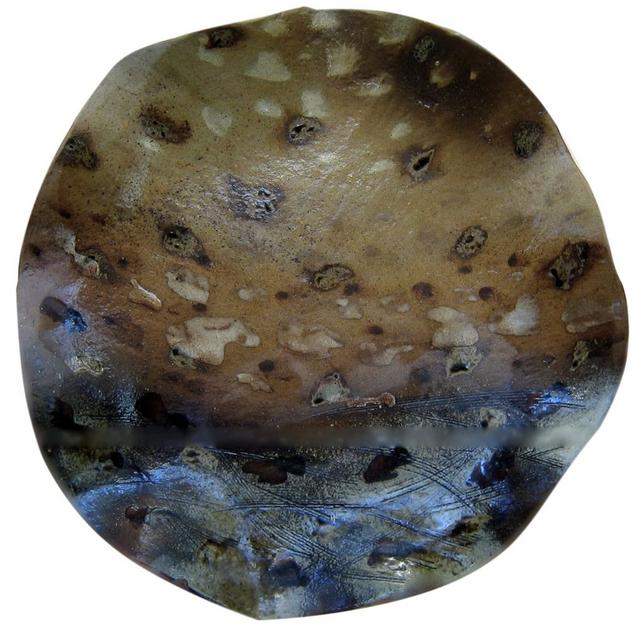 This free-form platter is Stoneware, from the 'Yandicoogina' series, made after visiting this area in Western Australia. It is 62 cms in diameter. 1999. The mining company. Hammersley Iron Ore, through my Perth agent, Marlene Stafford, invited me to visit the area, acconmpanying some of the mining company officials on a full day helicopter flight to various sites.Yandicoogina, a very ancient area was one of the places visited. |