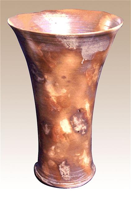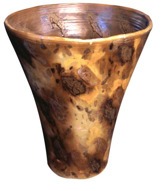 Floor Pot, 1998, 56 cms high, inspired by the landscape in the Olary Uplands, an area which has thousands of examples of Aboriginal rock-carvings, and a small amount of painted examples of what is known at Panarammittee painted-style art. _Most of these petroglyph sites are on private property and their whereabouts is kept 'in house.' These areas should only be visited with the permission of the owners. |
