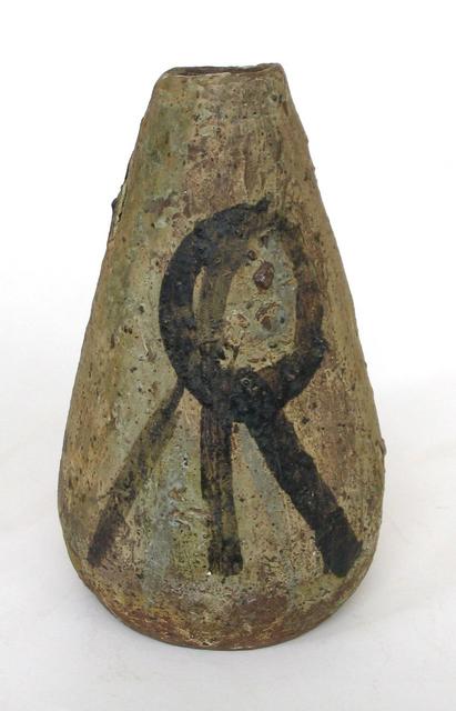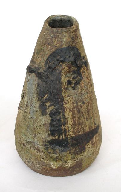 This pot was fired to a mid-range temperature around 1200 degrees. The glaze is a Colemanite-modified glaze and is more like a dry engobe.