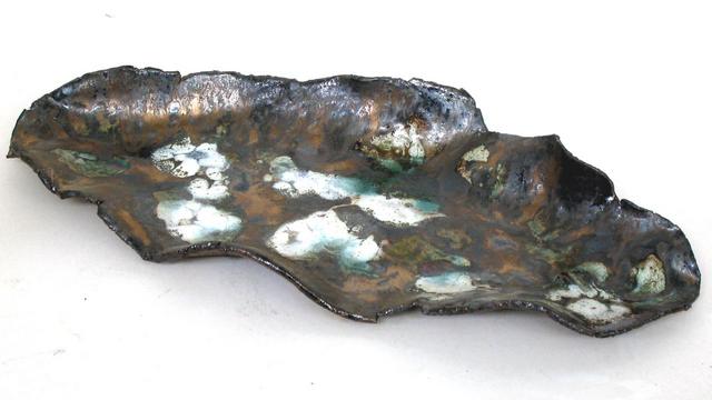 This is a table-piece with tin oxides and manganese dioxide surface decoration. Made in 2008 it is 30 cms in diameter. |