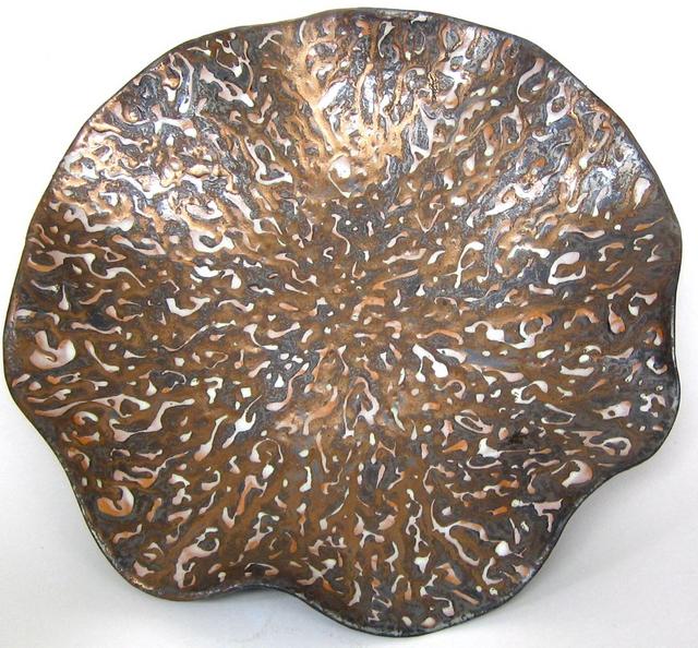 This free-form platter is 50 cms in diameter. It was made in 2008 and glaze effects are from tin oxide and manganese dioxide. |