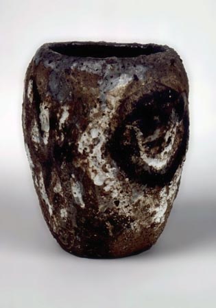 Vase, 1962. Mid-range firing. Made at Tarragindi. It is in the Art Gallery of South Australia collection. I recall that at that time I was experimenting with different sorts of decoration. The clay was very rough and unfiltered. |