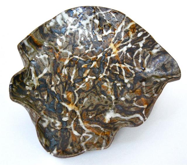 Free-form dish. Table piece? It can be used for biscuits etc.Approx 30 by 30 cms. Stoneware. Multiple glazes brushed and trailed. 2010 |