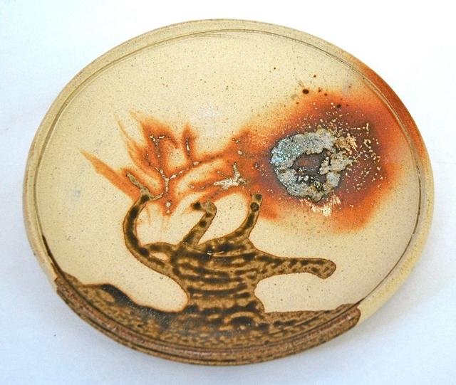 This heightened colour comes from contact with olive-wood fuel burned during the firing, The red is a fugitive colour that can also yield yellow. I have used this oxide for many years and don't know its chemical composition but I can hazard a guess from the way it behaves. It can also yield a soft pink on a neptheline syenite glaze fired under reduction. 2010 |