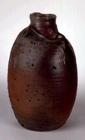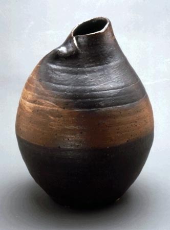 Jar form, made in 1973, 31.5 cms tall. It was made in the Adelaide Rose Park workshop and is now in the collection of the Art Gallery of South Australia. Stoneware, gas-fired, the top part of the pot is affected by the fine vapours of a lightly-applied ash glaze. |