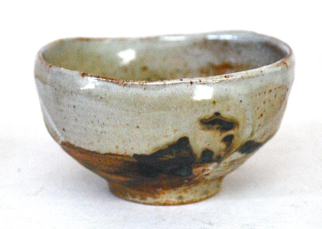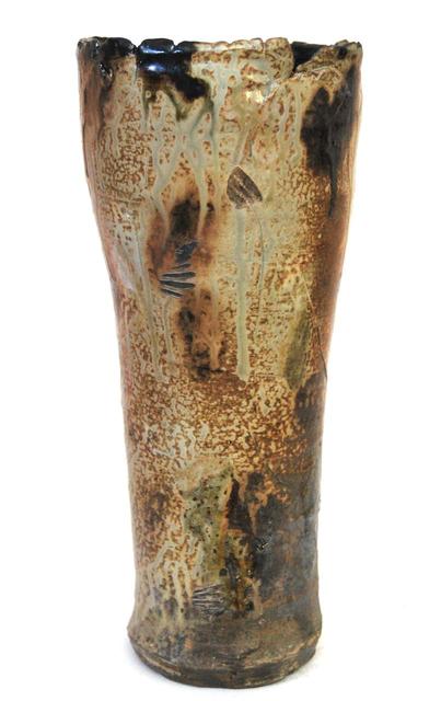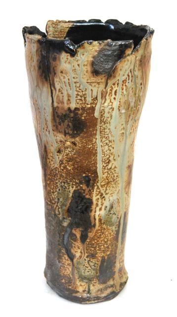 This tall vase was re-fired, on its side resting on clam shells. Stoneware it has multiple glazes, mostly ash-based. It is 40 cms high and 17cms at the mouth.