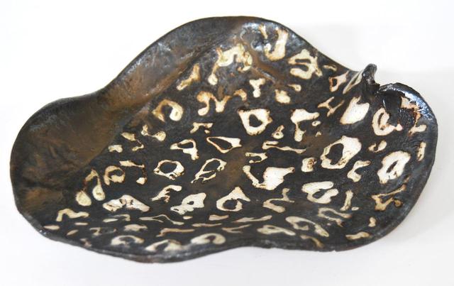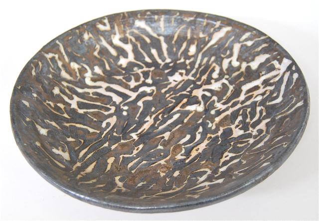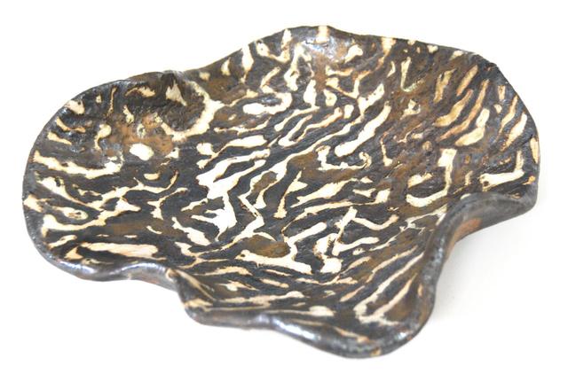 Platter, stoneware, 35 cms. diameter. This technique is time-consuming to do but the effect is quite dramatic. As one gets older it is a strain on the eyes. It also requires a certain deftness in handling the brush. Free-form plate. Stoneware, approx 24 cms in width. The comments on the previous bowl shape apply to this one also. Free-form plate. Stoneware, approx 24 cms at the widest point. The white is a tin oxide opacified glaze. The background is manganese and copper. |