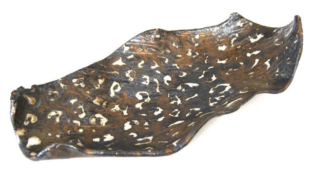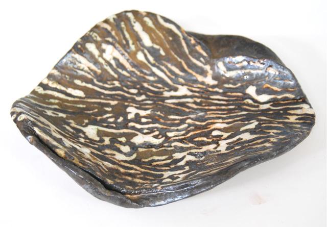 Free-form plate, Stoneware. approx 24 cms at the widest point. The same comments as the previous ones apply in this case too. Stoneware, free-form plate. I briefly considered framing them glued to a back-board. Then it wouldn't be a pot anymore but a picture of sorts. If I did a dozen of them the same way they could be an installation. Truly? No, I'm too old to become part of that fashion. A longer form of the earlier ones but this one is 45 cms. long |