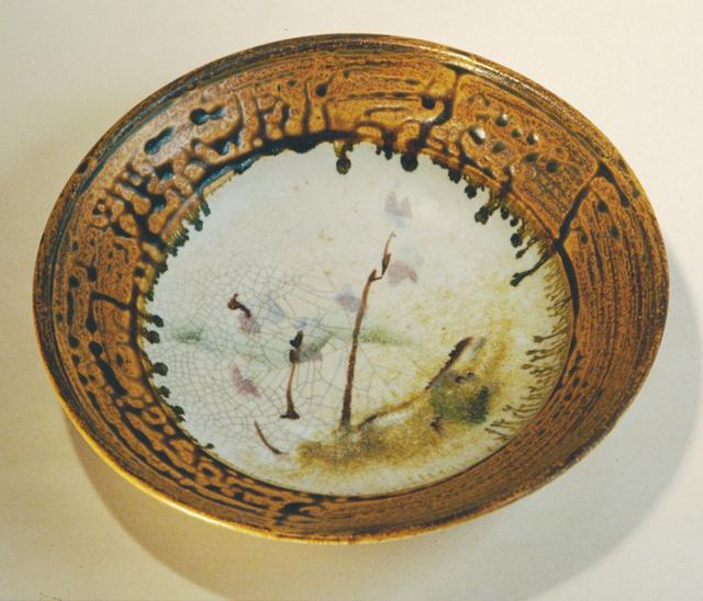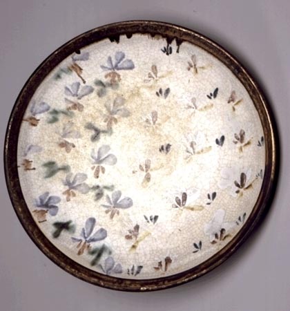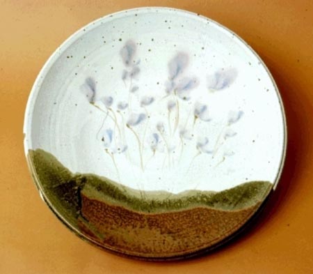 Platter. 1978, 46.2 cms diam. Collection of the Art Gallery of South Australia. It recalls a Japanese experience, of a strong breeze blowing blossoms from a tree. The glaze is a neptheline syenite one and the decoration is mainly copper and manganese.