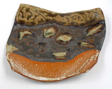 This sort of dish used for 'kaiseki' servings in the tea ceremony is challenging in mood. The dish is about 16 cms across and would hold small portions of food, or sweets. It is more the type used in happier chanoyu, rather than a more sombre 'wabi' occasion._In our culture, this dish is useful for small cakes or biscuits, or sweets and the like. |