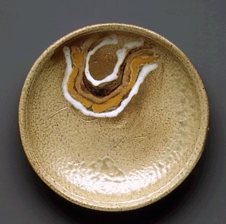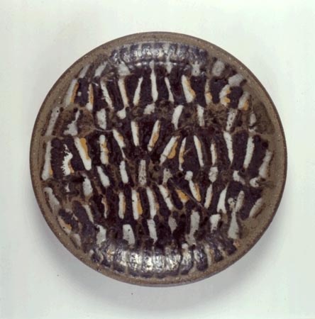 Shallow bowl; made at Summertown in 1991. 30 cms diameter. Minimal decoration and ash glaze. Photo Clayton Glen. This pot was actually conceived and decorated the other way up. But, being upside-down it is of interest still, I think. |