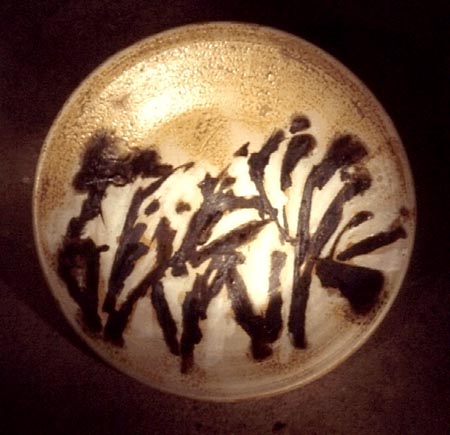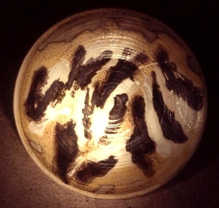 Bowl, 1990, approx 56 cms diam. the rather gestural decoration was inspired by the ancient Aboriginal presence in the Olary Uplands and other areas of this country. |